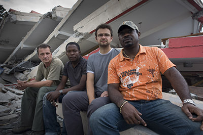 Fotograf Christoph Püschner, Fahrer Junior, Focus-Autor Wolfgang Bauer und UEbersetzer Robert vor einem eingestürzten Geschäftshaus.