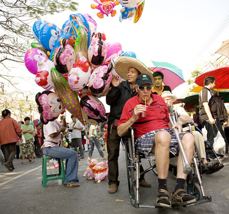 Reinhard Heinis (73 Jahre) und die anderen dementen Patienten machen in Thailand einen Ausflug. Auf dem Markt findet gerade ein Volksfest statt. © Kathrin Harms / Zeitenspiegel